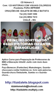 O premio será 01 CD com 123 Histórias com textos, e, visuais coloridos prontinhos para imprimir e contar na EBD, Culto Infantil, EBF, Aniversários, Escolas...